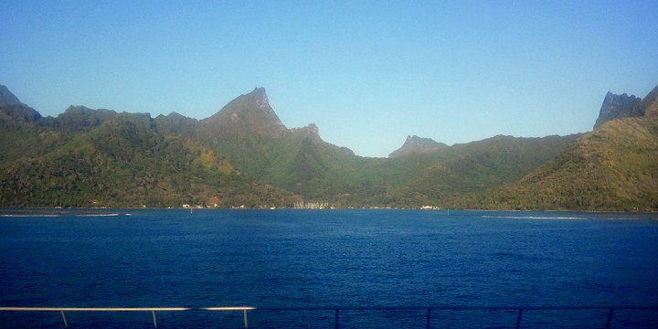 Aboard the ferry, approaching the narrow opening in the reef surrounding Moorea.