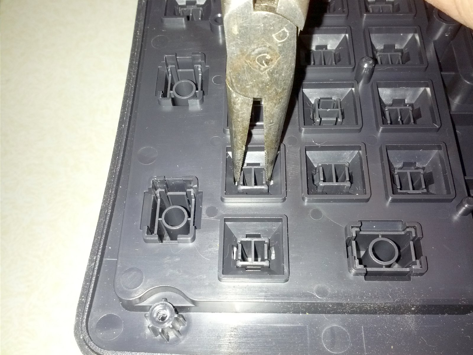 Using a pair of needle-nose pliers, gently squeeze the plastic tabs that keep each key from falling
