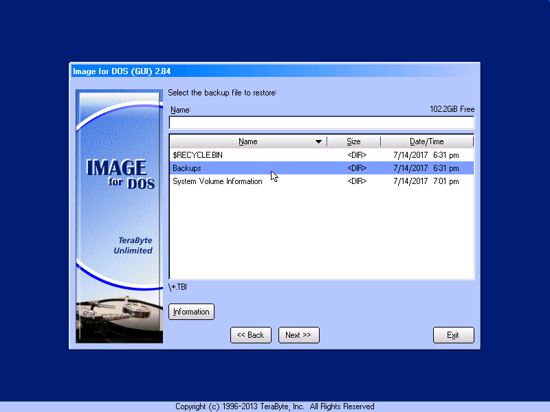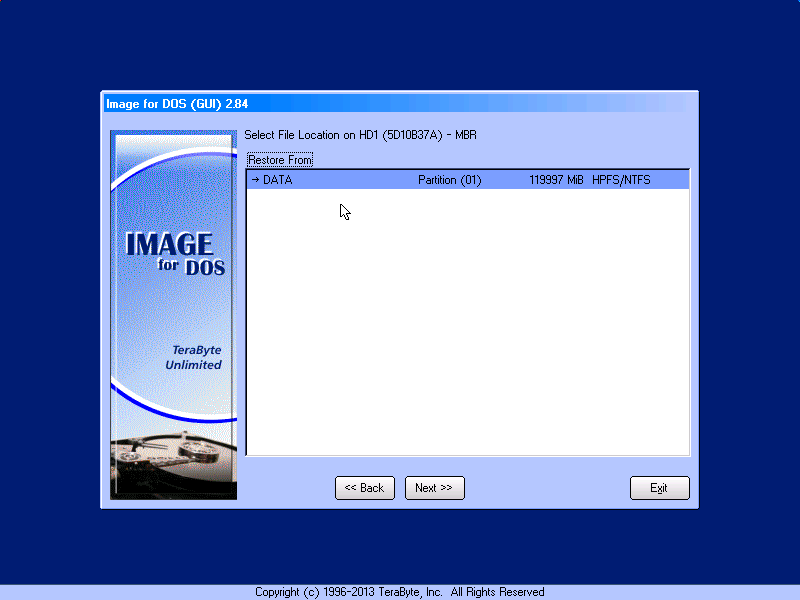 In this example, the backup image is \Backups\Terabyte\IFD-test-image.TBI in the DATA partition on Hard disk 1.